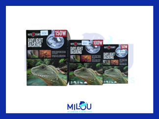 Crea un punto de basking focalizado con temperatura elevada, simulando la luz solar natural para promover la termorregulación, digestión, actividad, apetito y procesos fisiológicos naturales (incluyendo reproducción). Contiene radiación UVA beneficiosa para el bienestar psicológico y comportamental de reptiles diurnos; emite bajo nivel de UVB (no sustituye a lámparas UVB específicas). Ideal para especies tropicales y subtropicales como iguanas, dragones barbudos, agamas, gecos diurnos, tortugas y anfibios. Recomendada combinar con lámparas UVB (ej. Repti Planet UVB) y usar con portalámparas cerámico y termostato para control preciso de temperatura. Rosca estándar E27; disponible en potencias de 50W (terrarios pequeños/medianos), 100W (medianos/grandes) y 150W (grandes o altas necesidades térmicas).